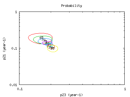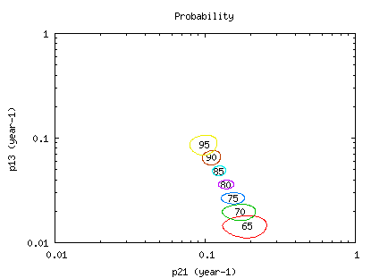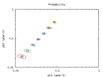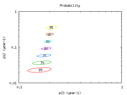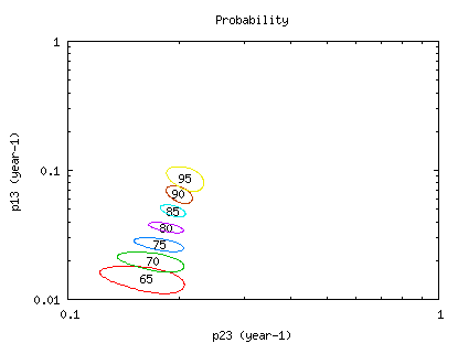 Ellipsoids of confidence centered on point (pij, pkl) are estimatedand drawn. It helps understanding how is the covariance between two incidences. They are expressed in year-1 in order to be less dependent of stepm.